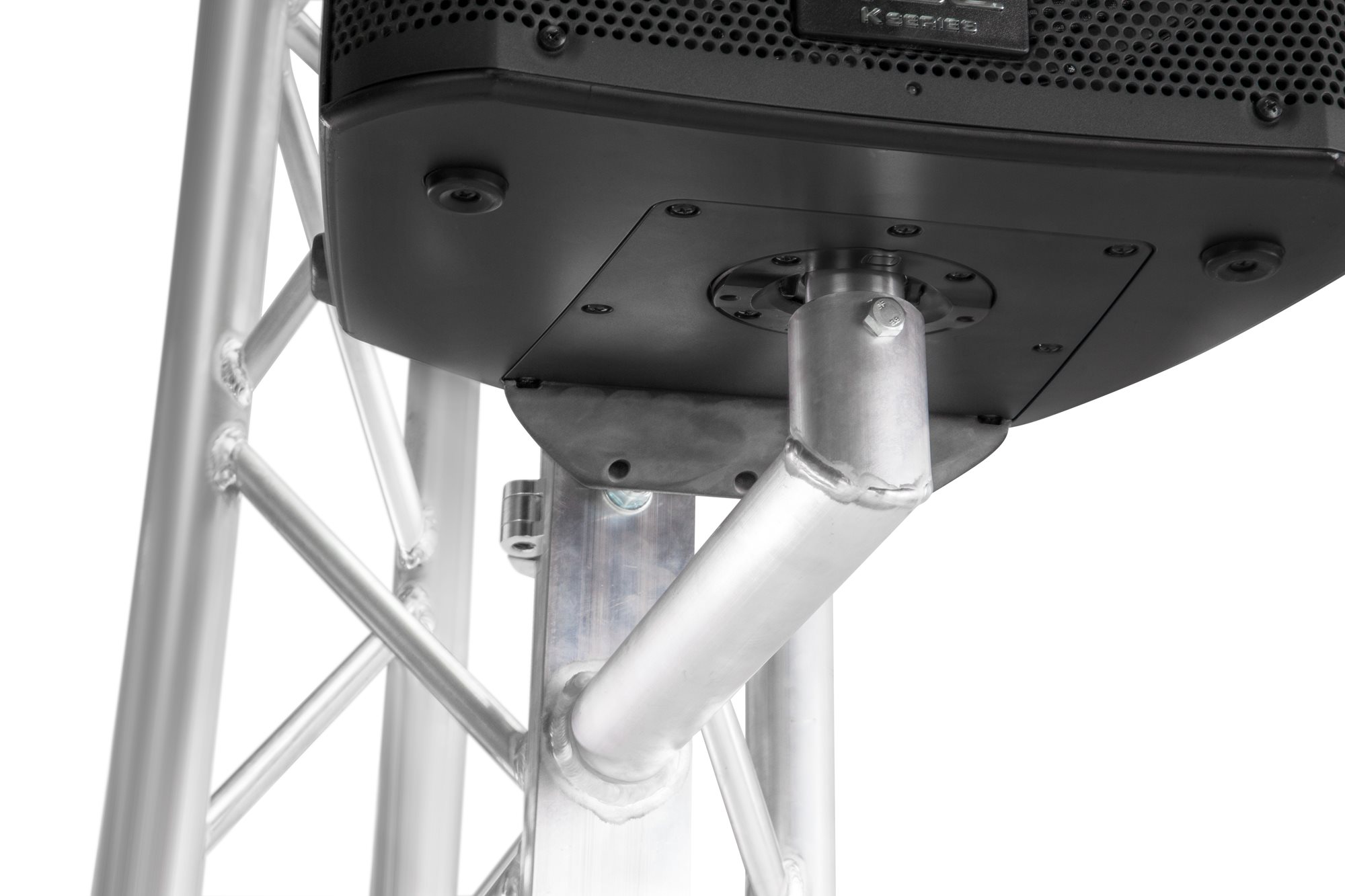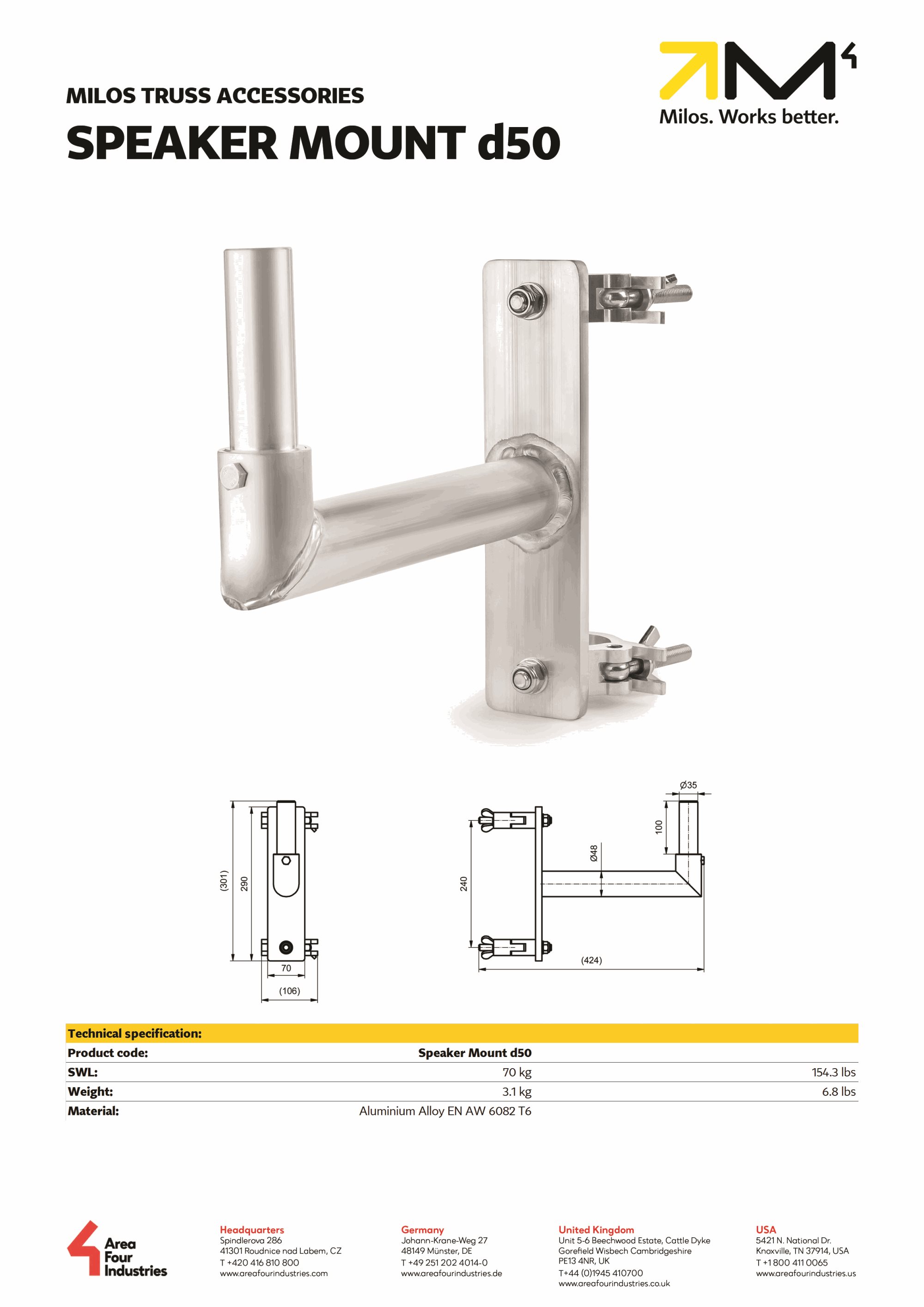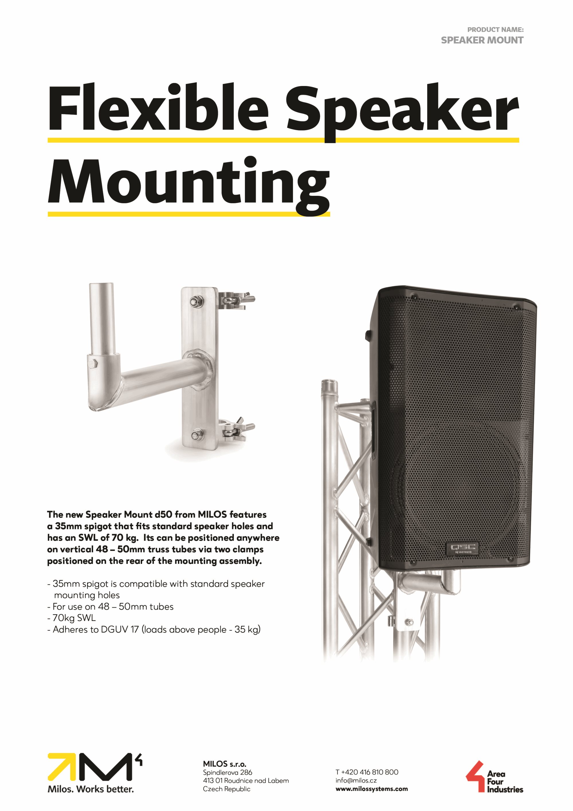 MILOS Speaker Mount d50 features a 1.38'' spigot that fits standard speakers hole and has an SWL of 154 lbs. Its can be positioned anywhere on vertical 1.89'' - 2'' truss tubes via two clamps positioned on the rear of the mounting assembly.