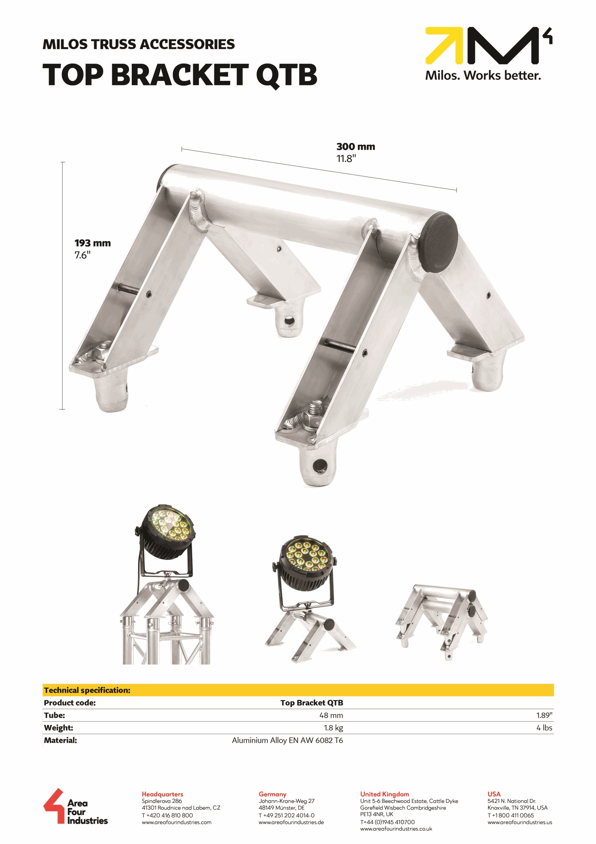 MILOS introduces the new Top Bracket QTB, which allows you to mount your lights not only on the truss but also on the floor thanks to its unique design. The Top Bracket QTB is stackable and compatible with U, F and B connection systems. Experience a new range of lighting placement options - from high to low.