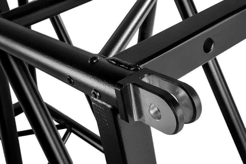 It features connection points in the end frames and compression tubes for slinging relevant framework nodes. As with all steel truss from MILOS, it features double fork couplers, zinc coated pins and has highly impact-resistant matt black paint.