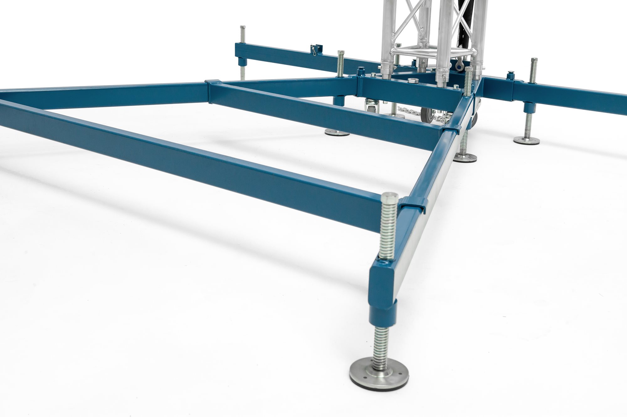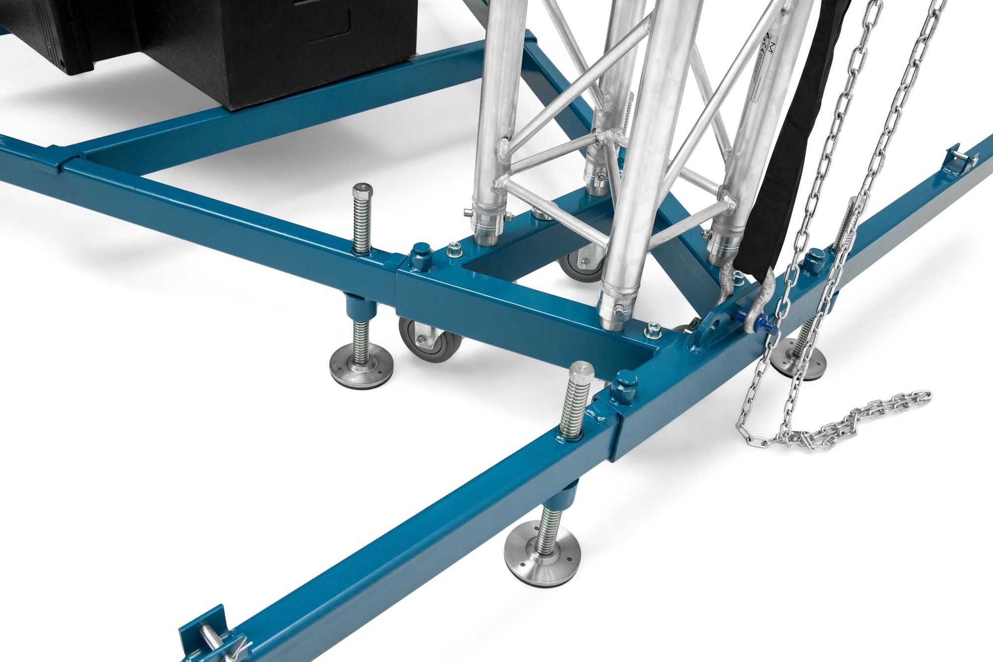 Set up is easy. Only a few 290 QTV truss components are needed to erect the tower and only 2 persons are required to accomplish this feat. Due to a height of just under 5 meters, approvals by authorities are not necessary. The design allows for placement of base cabinets or amplifier racks on top of the outriggers.